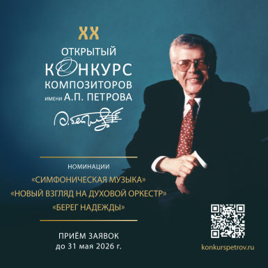 Уважаемые композиторы! Объявляется двадцатый, юбилейный Открытый конкурс композиторов им. А.П. Петрова. В 2026 году к двум прежним номинациям – «Симфоническая музыка» и «Берег надежды» – организаторы конкурса добавили третью – «Новый взгляд на духовой оркестр», призванную вдохновить композиторов на создание новой современной музыки для духовых оркестров. Первые два тура Конкурса проходят заочно, а третий тур (финал) пройдет в течение трех дней в формате концертов-прослушиваний.